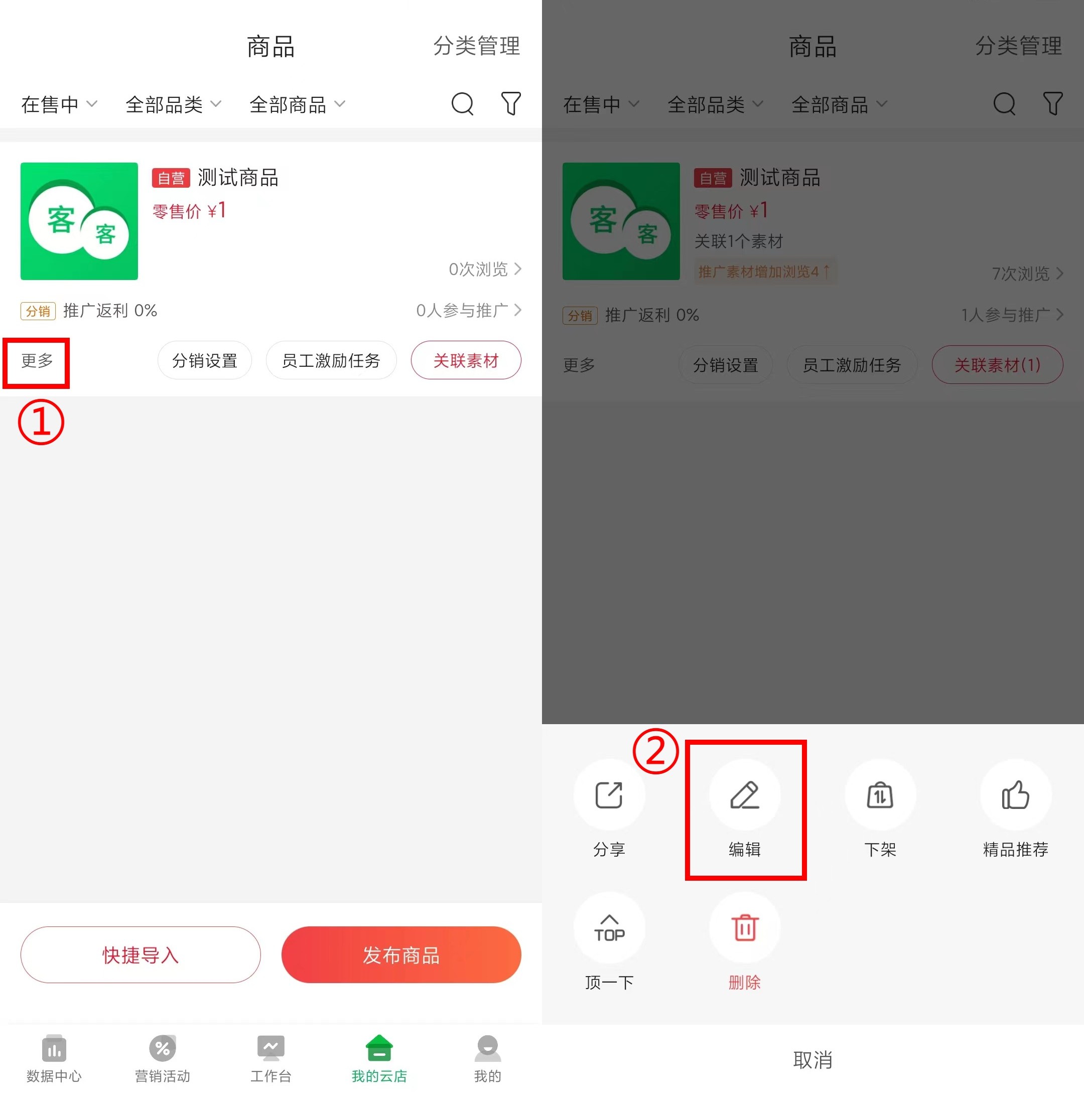 如要修改已发布的商品信息,登录APP->【我的云店】->找到需要编辑的商品->【更多】->【编辑】,就可以对商品信息再次进行编辑,编辑完成后点击【保存】即可生效。