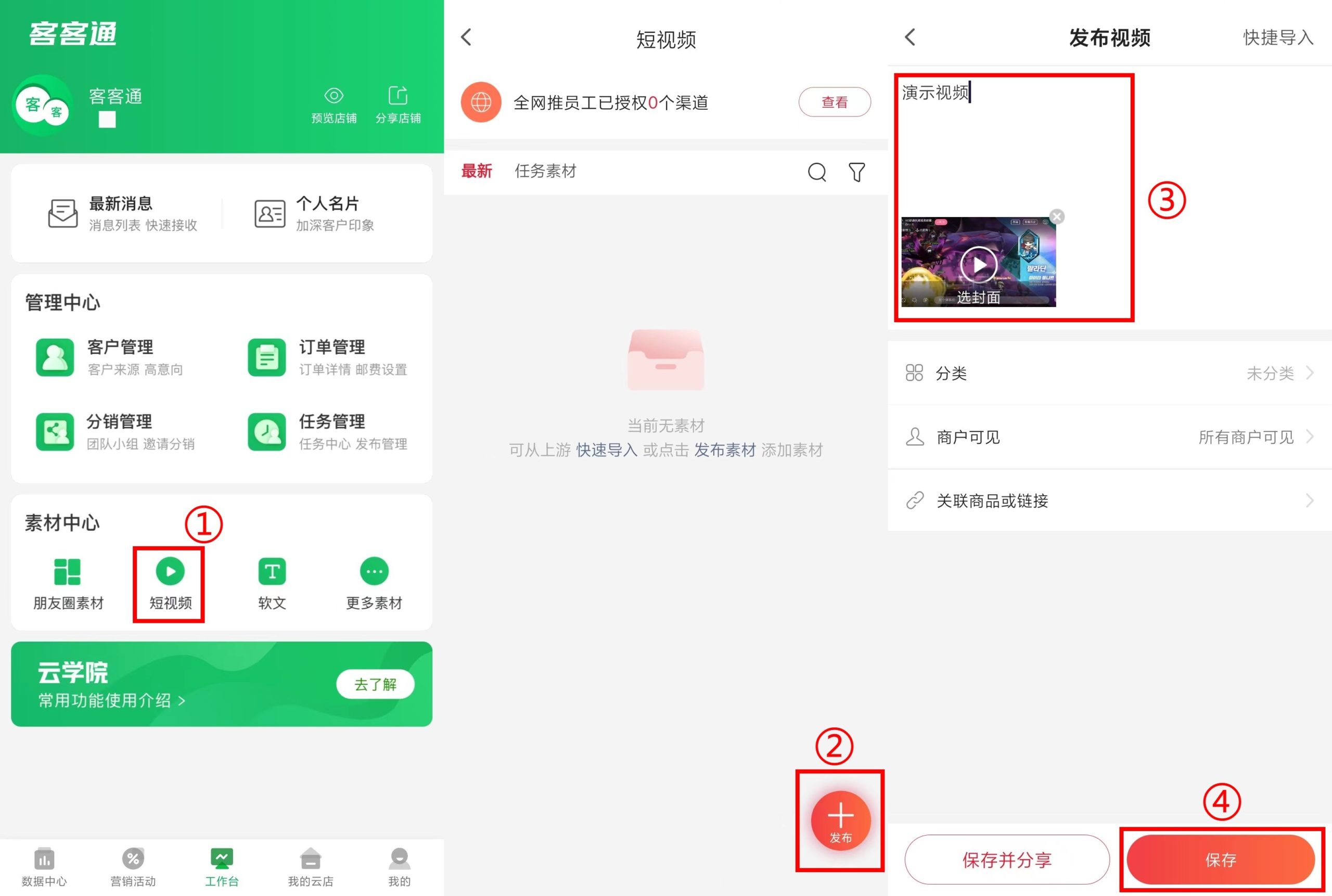 打开APP->【工作台】->【短视频】或【朋友圈素材】->点击右下角【+发布】可选(APP暂不支持发布文章,请在电脑端登录商户后台发布推广文章)。