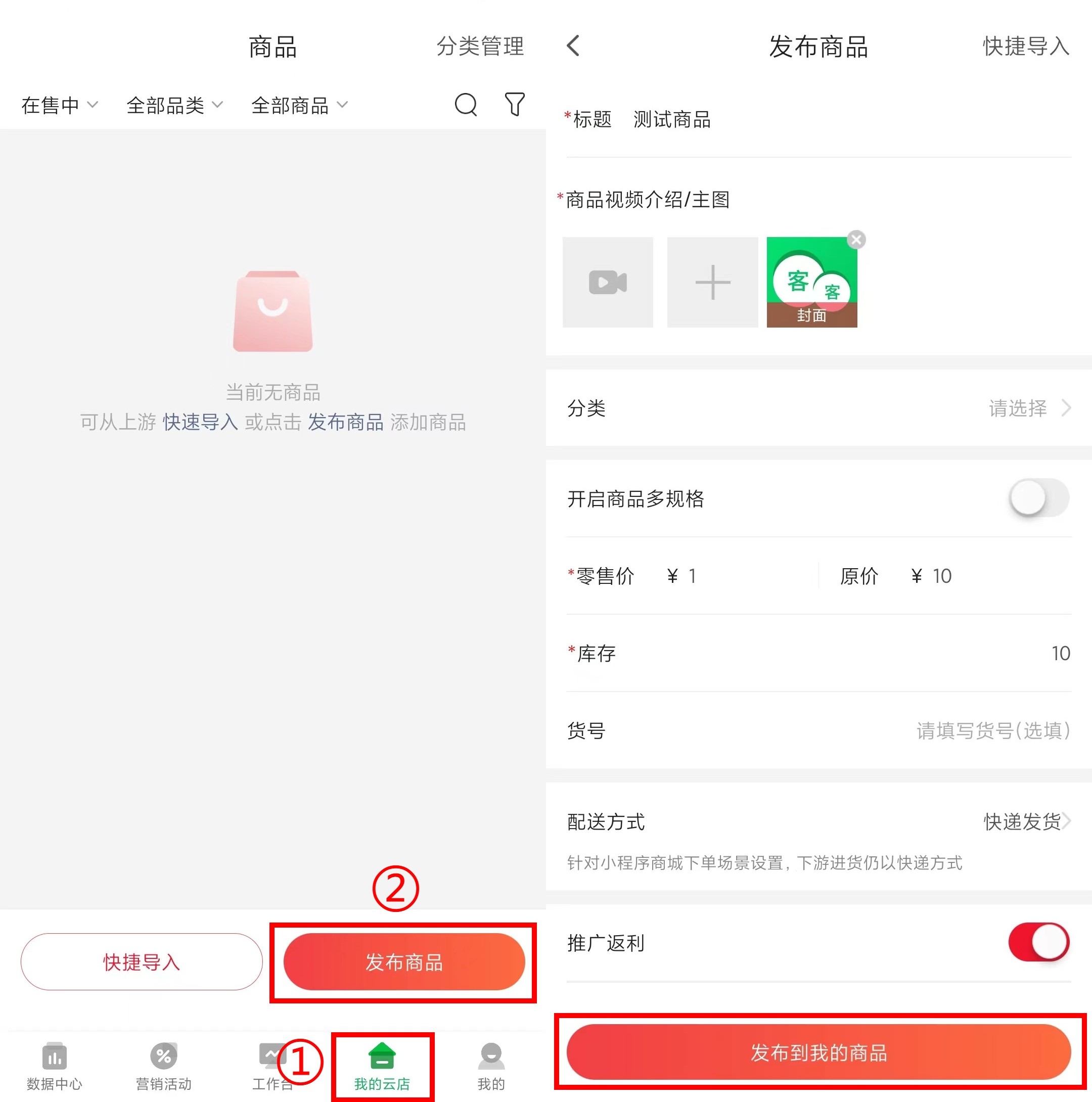 1、登录APP->【我的云店】->【发布商品】